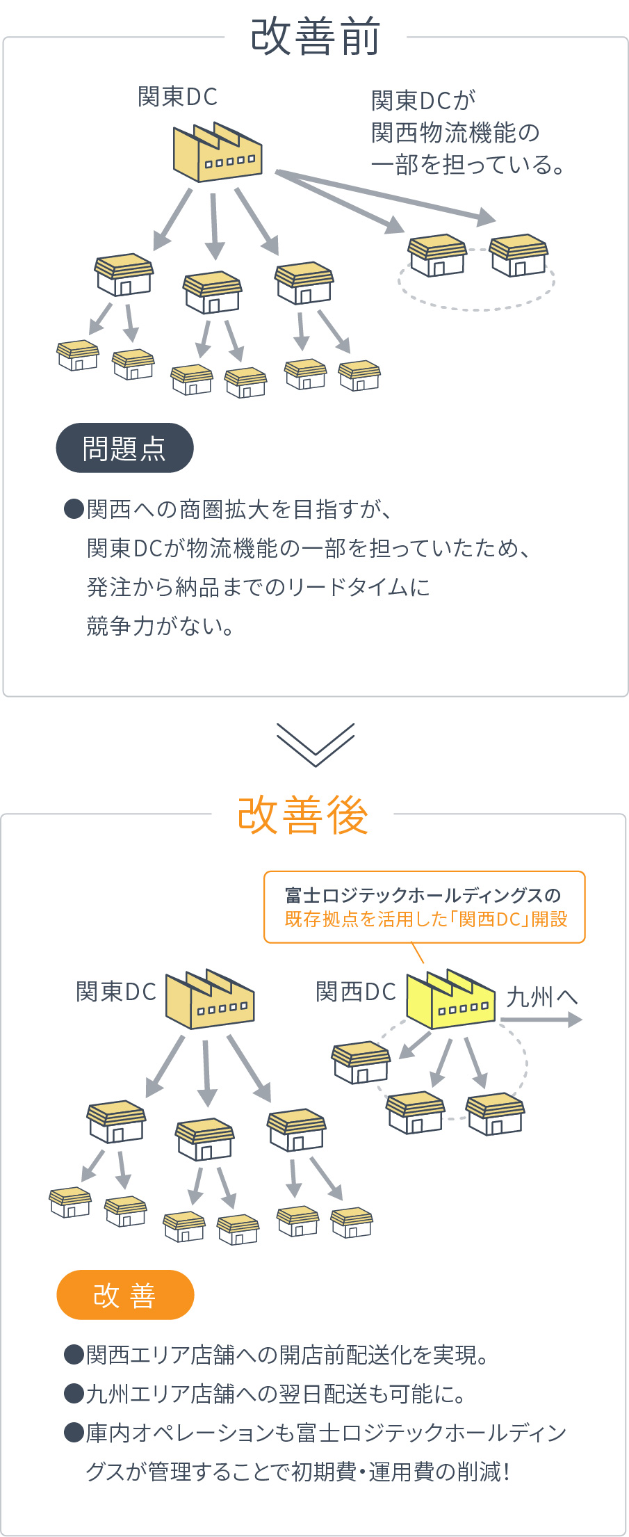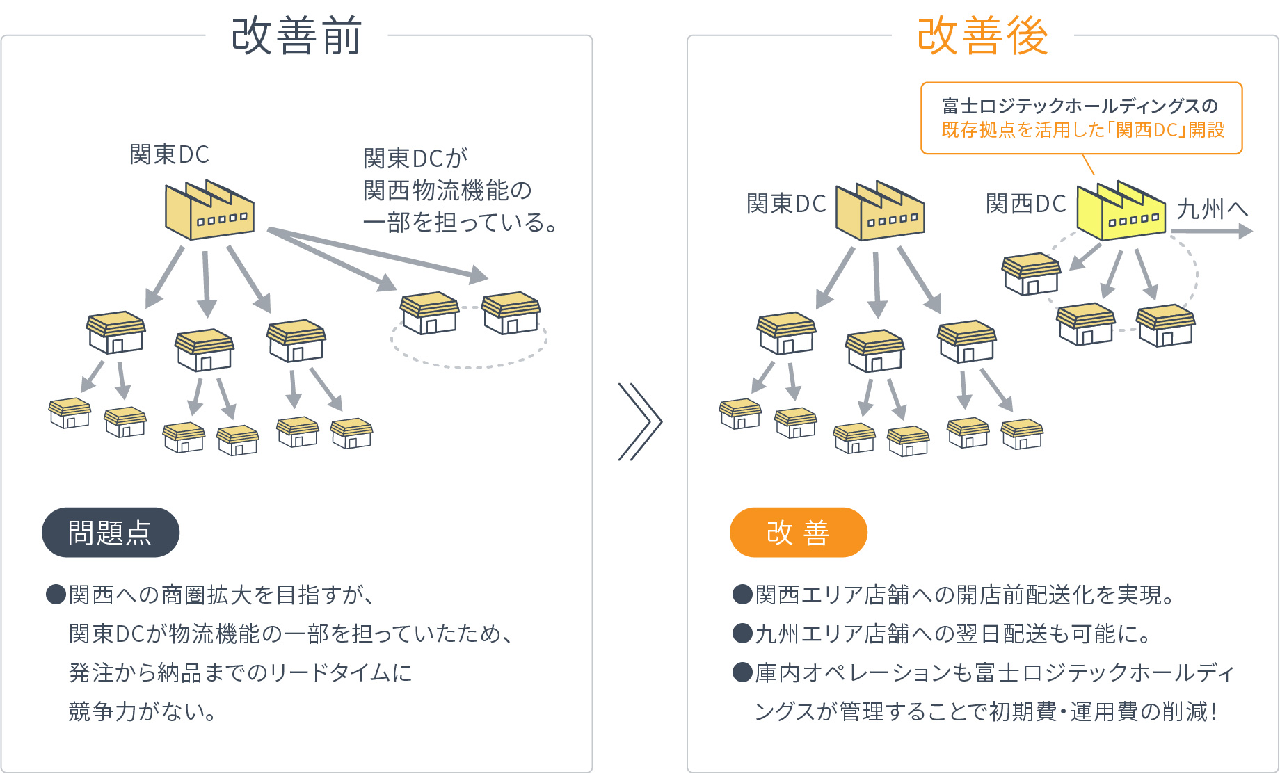工場や「関東DC」が一部物流機能を担って、西日本エリアへ出荷していたため、 発注から納品までのリードタイムに競争力がなかった