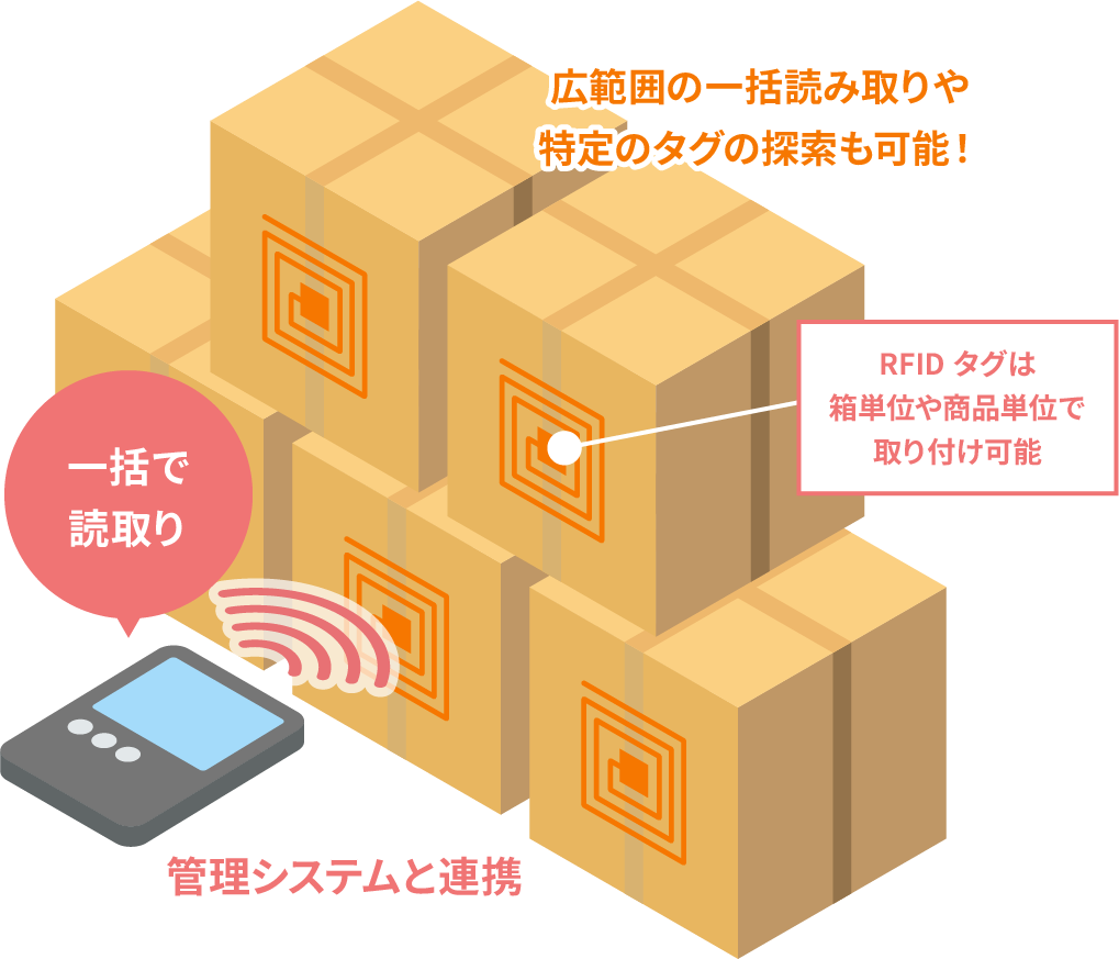 RFID技術は、バーコードと比較して読み取り距離が長く、複数のタグを同時に読み取ることができるなとの利点があります。このため、物流・在庫管理・返品対応・製造プロセスの追跡・レジ業務の効率化など、さまざまな業界で広く活用されています。