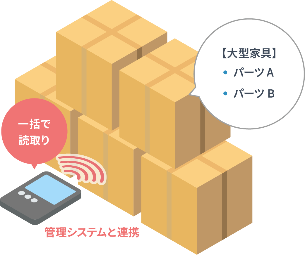 倉庫や店舗内でひとつひとつバーコードを読み込む形式でのの検品や 棚卸は、作業時間が大きく発生しています。 特に家具のような大型商品や複数の梱包からなる商品などは作業の手間がより多く、ミスや管理不足に陥ることも少なくありません。そんな現場に対し、RFID導入によって作業時間を大幅に短縮した上で正確性の向上も実現しています。 その他、自動車部品メーカーや絨毯など、ひとつひとつタグを探してバーコードを読み込む検品に労力がかかっていた大型商品での導入事例が数多く存在しています。